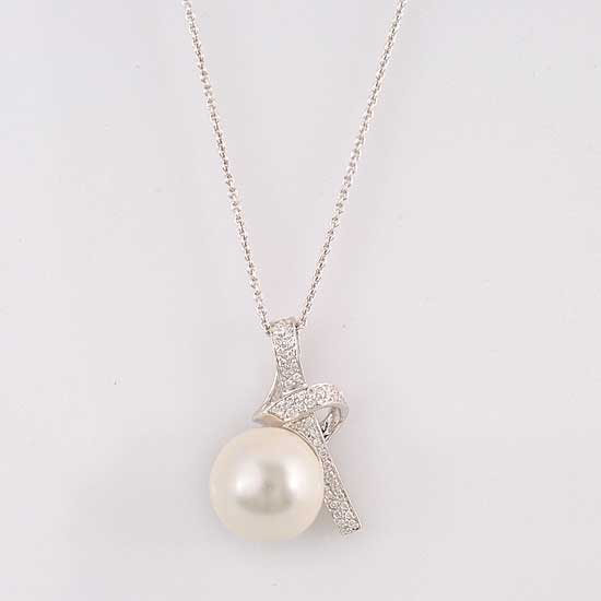 Displayed here is a pearl necklace with a classic and elegant look. The luster of the pearl exudes a sense of glamor with the combination of diamond decorations. This stunning pearl necklace is the perfect piece to enhance a ladies' jewelry collection.