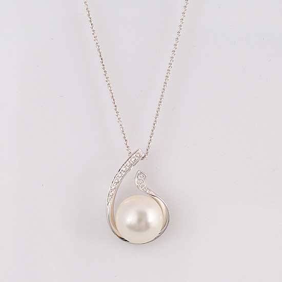 This pearl necklace features a precise design with the beautiful white gold construction. The diamond embellishment around the pearl brings a touch of glamor to the entire piece. This decorative pearl necklace is the perfect accessory for enhancing a nightdress.