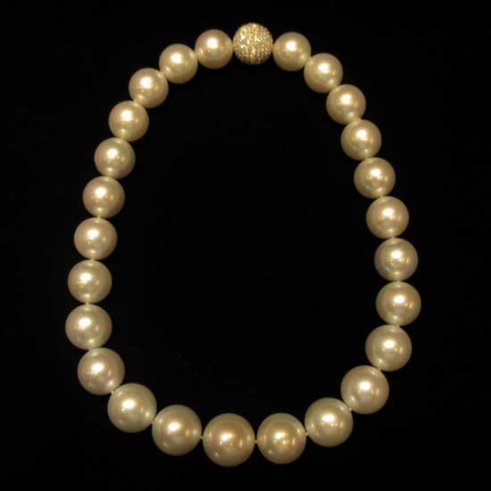 The shiny necklace showcases a graceful curve with the high-quality South Sea pearls from Australia. The classic design, further perfected by dazzling diamonds, definitely gives you a sense of elegance. The admirable necklace is an ideal item to complement your fine jewelry collection.