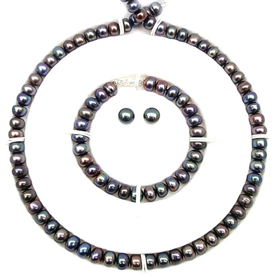 This stunning necklace and bracelet set is made from black pearls with beautiful luster. The classy pearl jewelry set will add a touch of elegance to any formal wear. The necklace and bracelet are secured with silver lobster claw clasps.