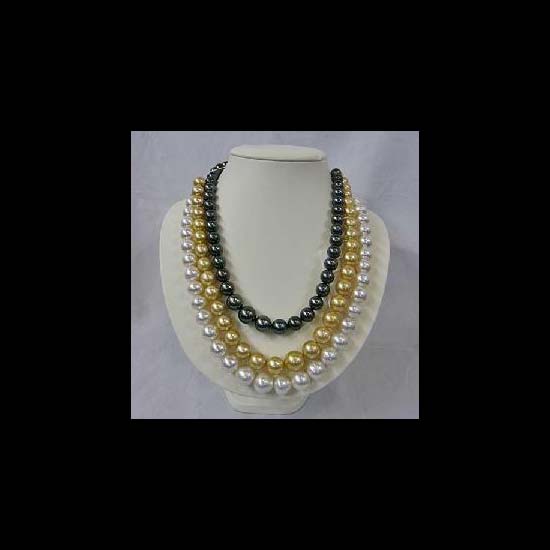 Graduated necklaces are made of opaque round yellow and white South Sea pearls