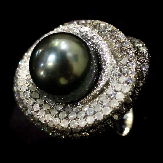 This ring centers a peacock green piece of Tahiti pearl. The pearl is well embraced in the gleaming glows of white gold, white diamonds, gray diamonds and icy diamonds. This handmade piece jazzes up your evening ensemble with an elegant twist.
