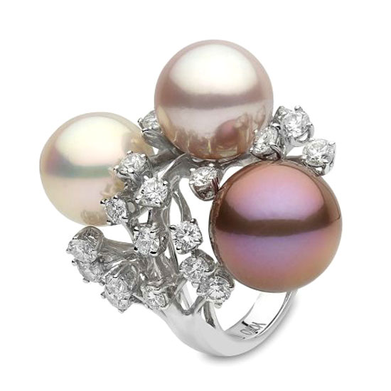 This is a natural white south sea and pink fresh water pearl ring with a luxurious design. It is finely crafted with dazzling diamonds for an elegant touch. This pearl ring surely is a great item for adding some glamor to your slender finger.