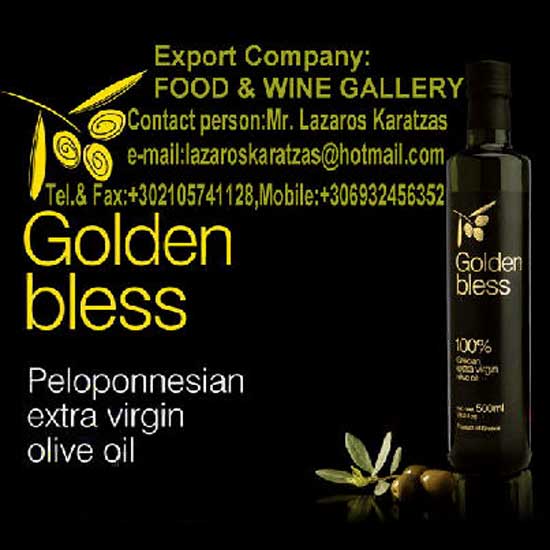 Featured is a bottle of extra olive oil from Peloponnese, Greece. The thick green oil can be used in any dish from salads to sweets. It is a relatively healthy oil to use in cooking for its low rate of artificial substances.
