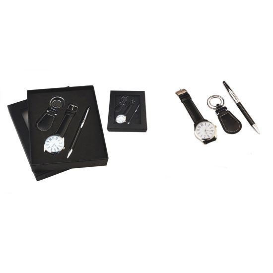 This stationery set features a classy black-toned design. An analog watch, a keychain and a roller pen are included. The stationery set is ideal for gift use.