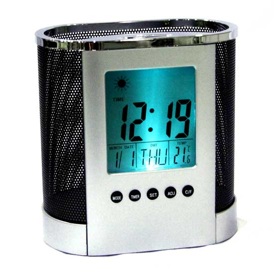 With a sophisticated design, the featured pen holder clock is a highly functional addition to your work desk. It can be used to hold pens and stationery items. The exterior of the holder features a digital clock.