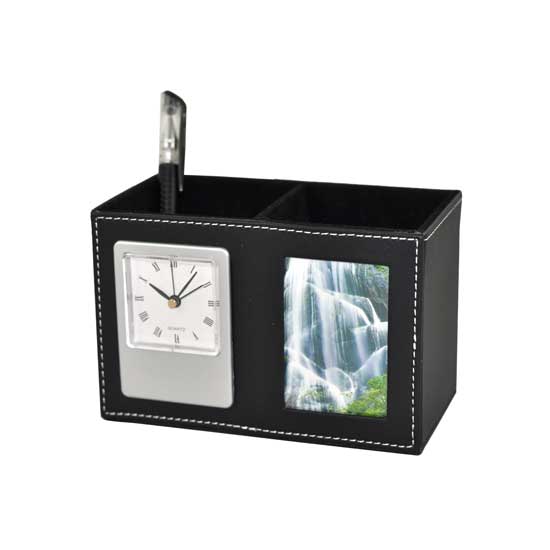 Shown here is a stylish pen stand that comes with a classic style in timeless black. This rectangular-shaped pen stand is designed with an analog clock for added functionality. This pen stand is a great addition to your office equipment.