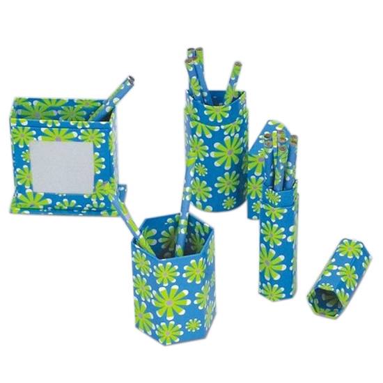 A set of pencil case with flower pattern printed. It is available in different sizes and shape. It can stand firmly on plain surface.
