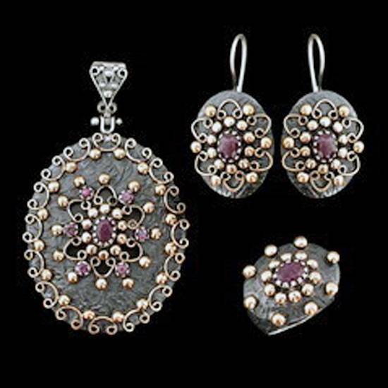 Earrings, pendant and ring of matching design make great accessories for all ladies. The pendant and the earrings have floral patterns that are surrounded by purple and gold precious stones. The exquisite design of these jewellery gives it an antique and unique touch of elegance.