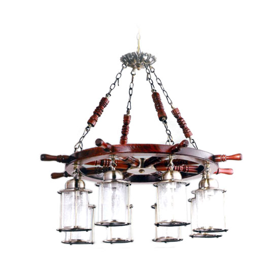This is a pendant lamp that comes with 8 shades. Inspired by sailing ships, this lamp features a wheel-shaped pendant holder. The shades resemble lanterns, completing the unique look.