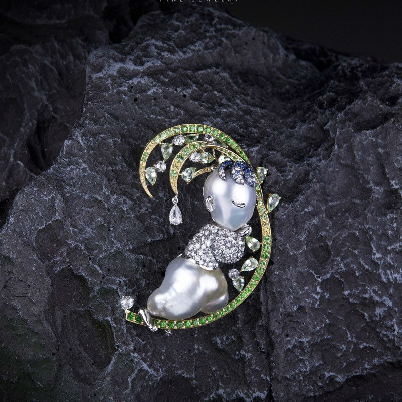 This artwork is made of keshi, baroque pearl and diamonds, saffron, sapphire, yellow sapphire and green tourmaline.