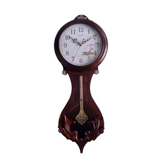 Displayed is a pendulum clock that comes in an elegant design. Featuring a round dial with roman numeral markers in a classic style, this clock has a pendulum case crafted with sophistication. This pendulum clock houses a high quality movement for accurate timekeeping.