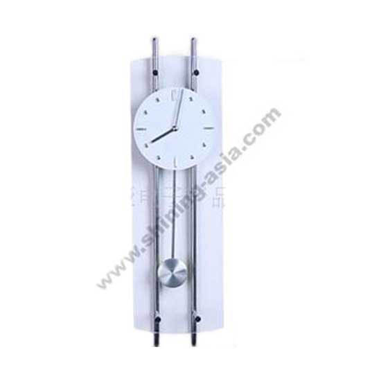 Showcased is a wall clock with a pendulum design. It is finely made of metal and glass for a touch of modernity. This pendulum wall clock complements your home decor in a classy way.