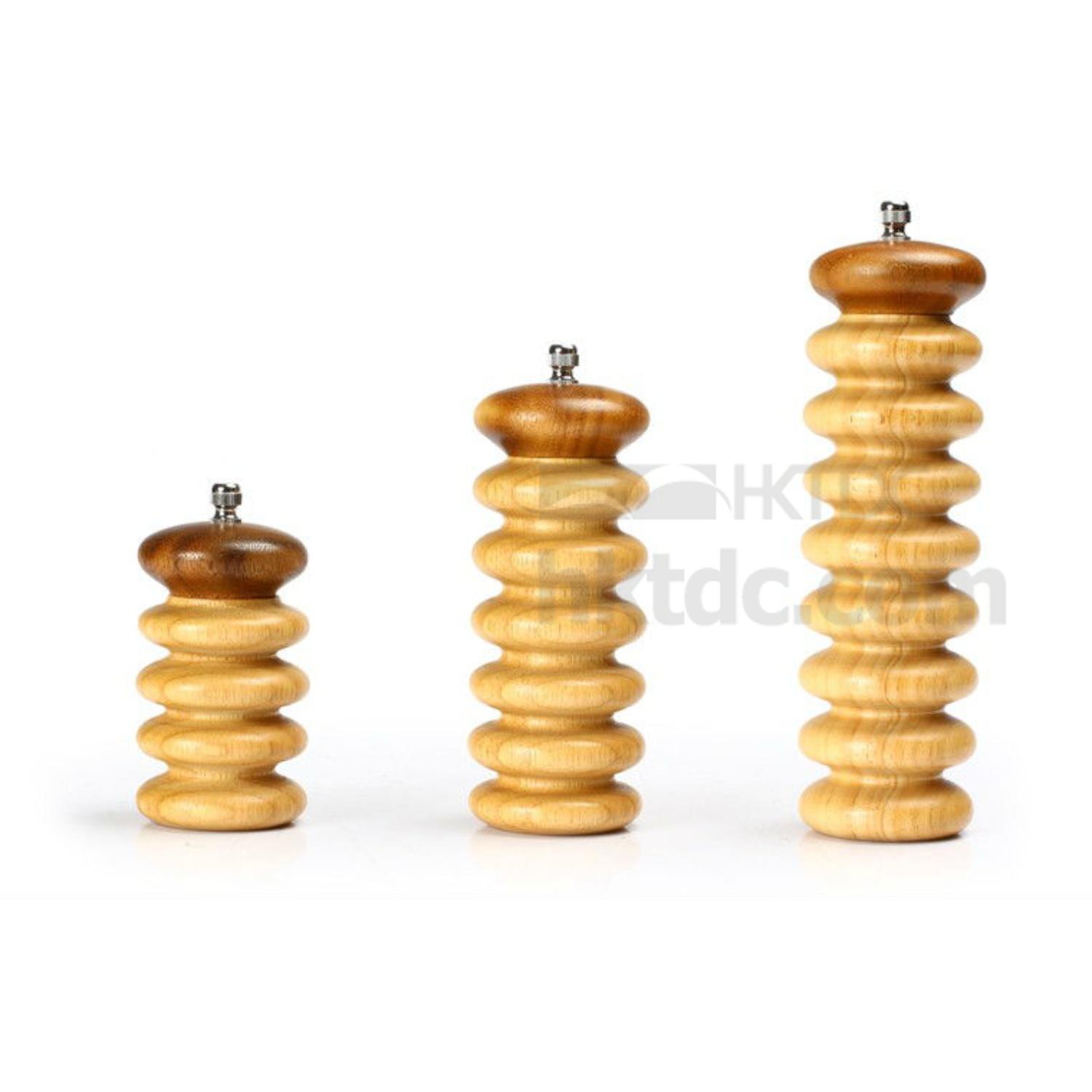 Pepper grinder in exotic wavy shape. Two-tone mix of rubber wood body & acacia knob. Equipped with ceramic mechanism plus aluminum-oxide for more durability.