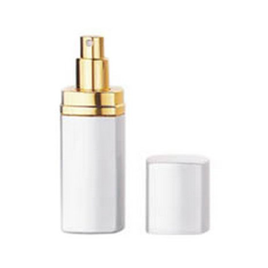 This is a perfume atomizer with a dainty and elegant design. It features a white body, a golden nozzle and a white cover. This item is made of aluminum for a durable structure.