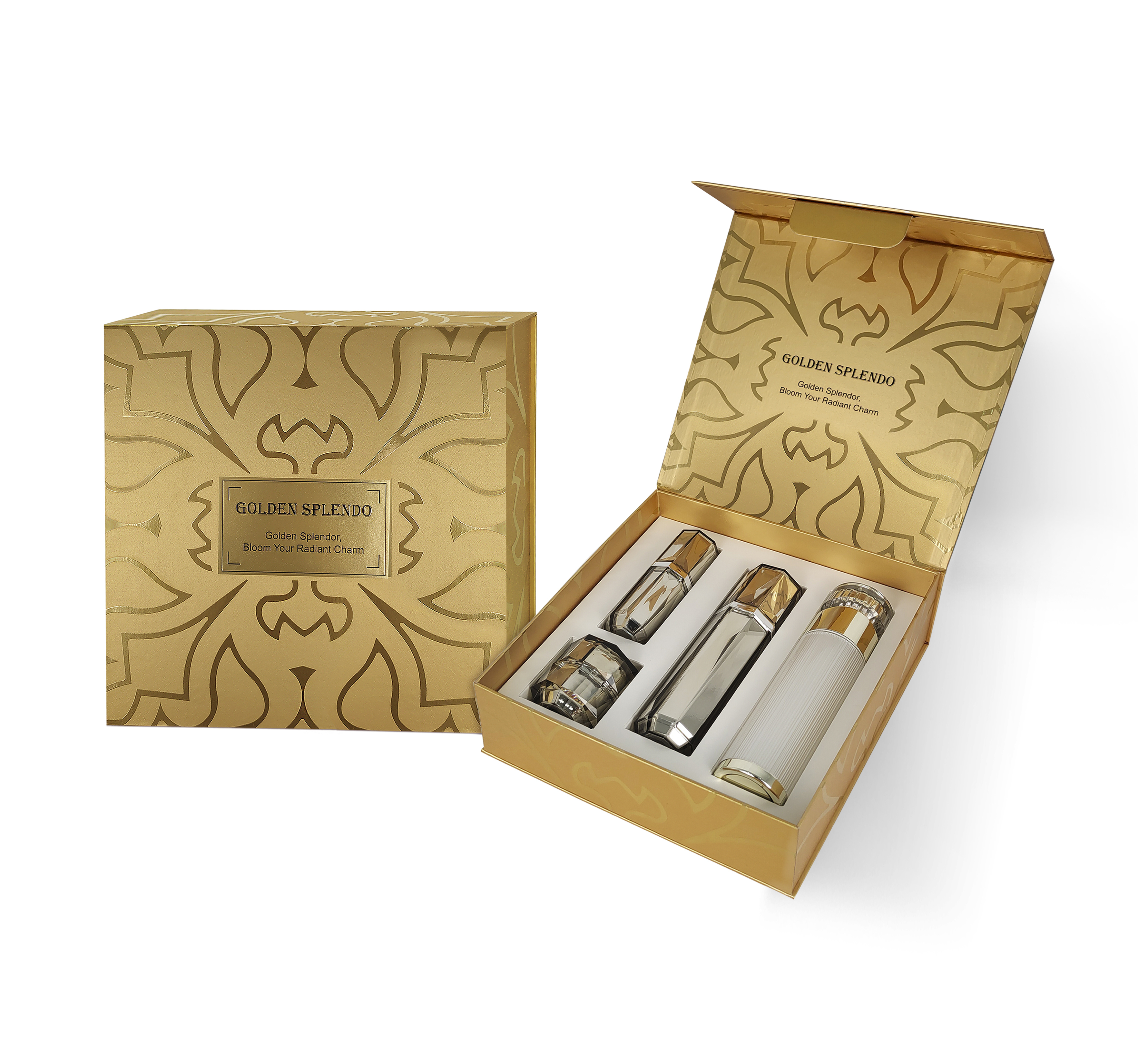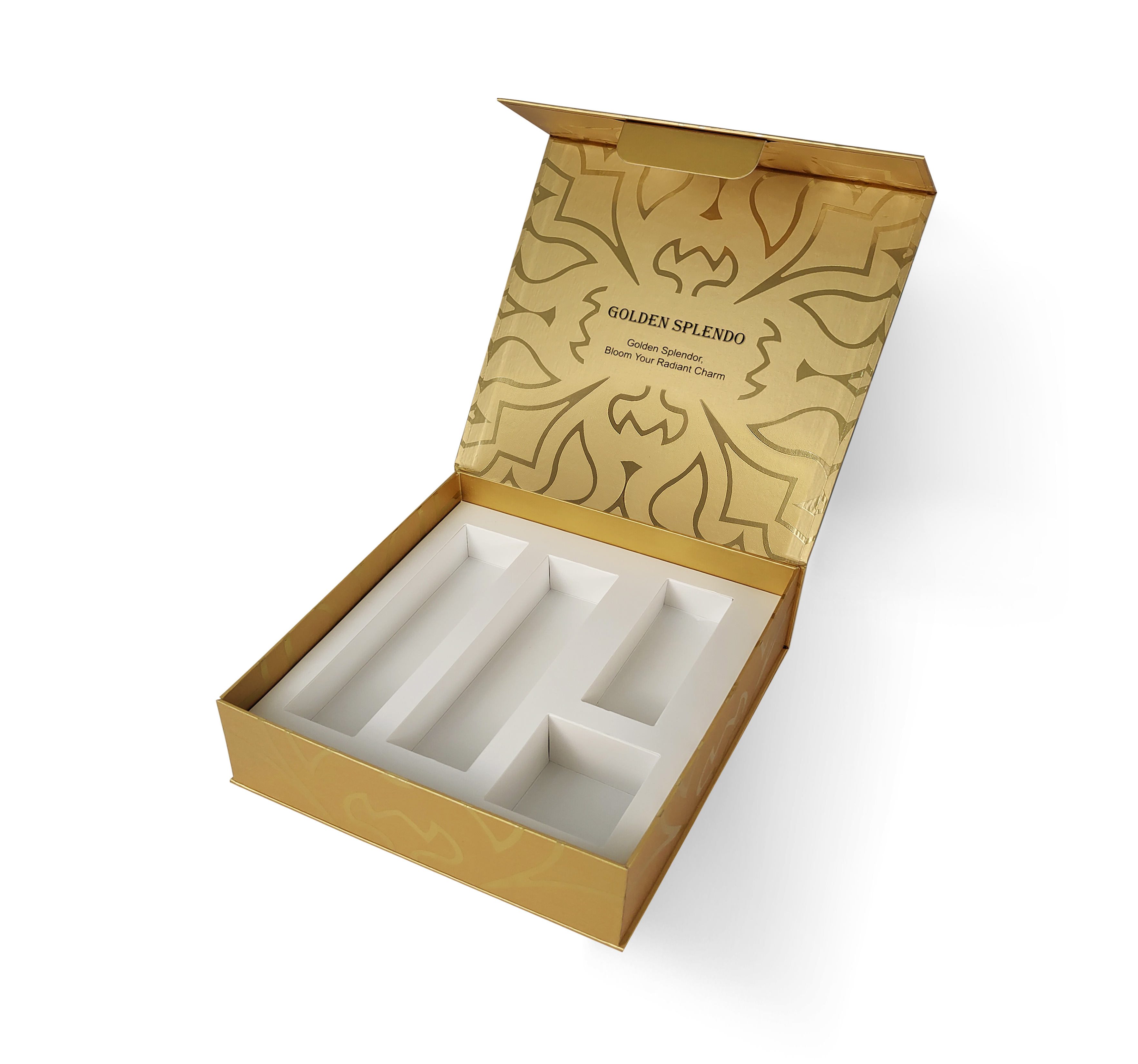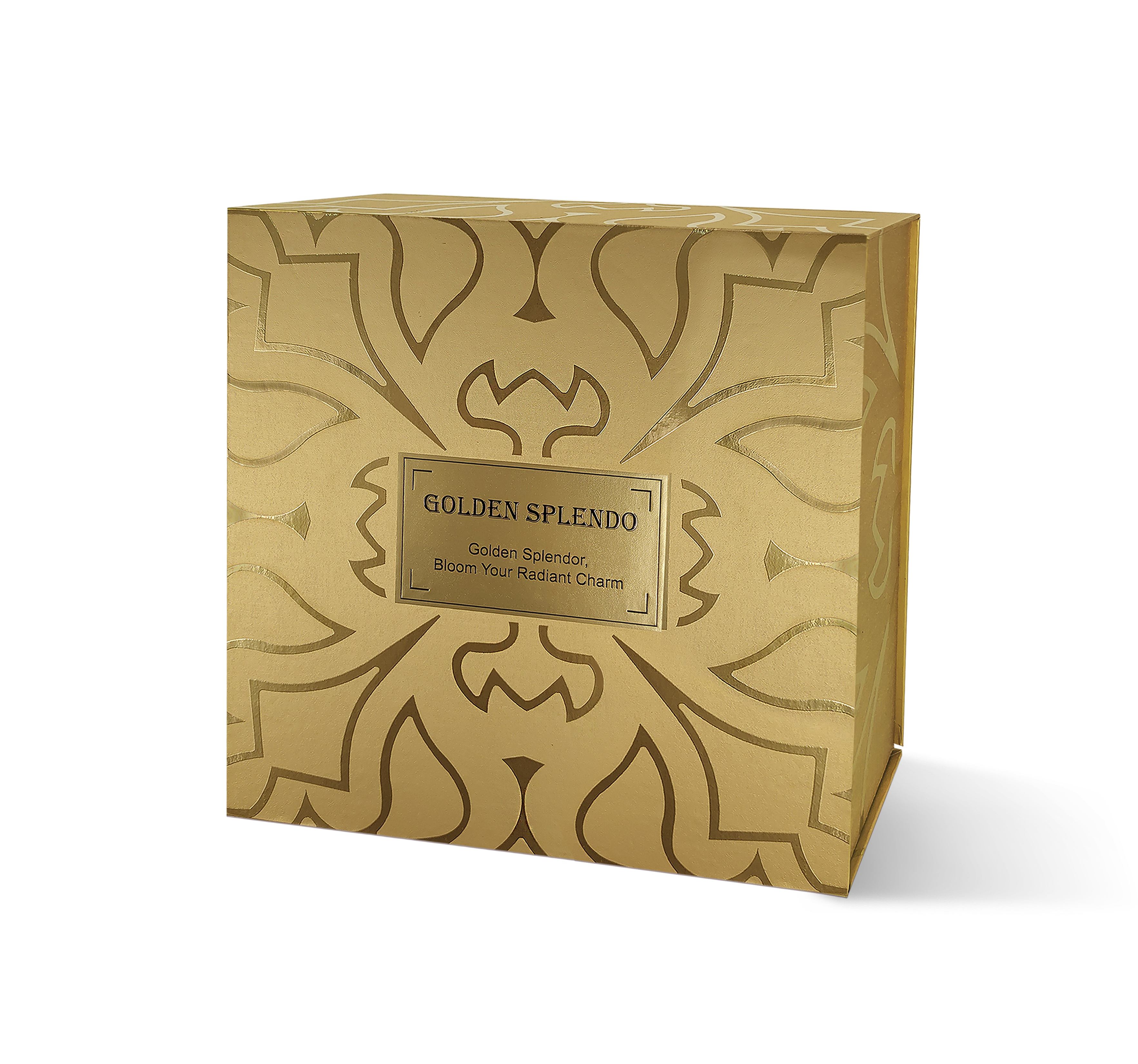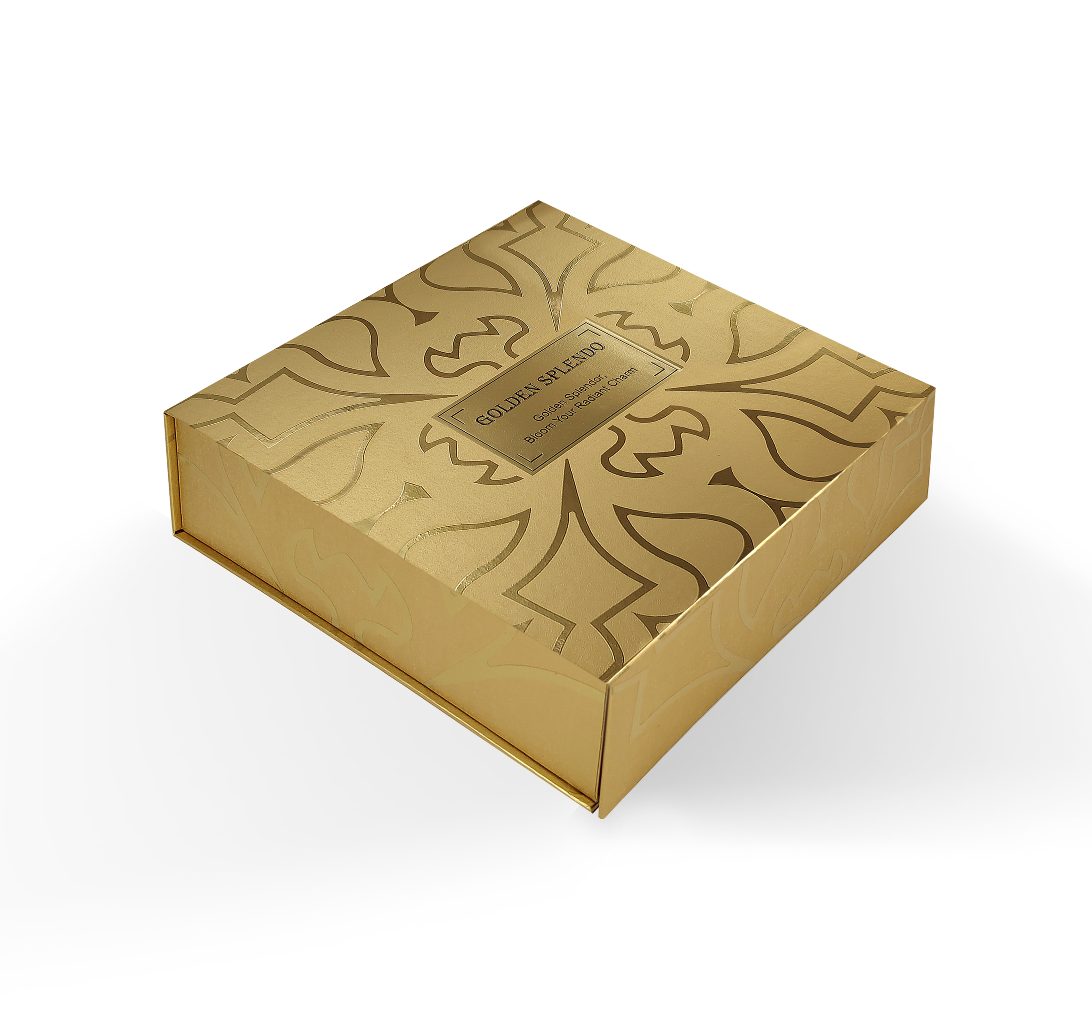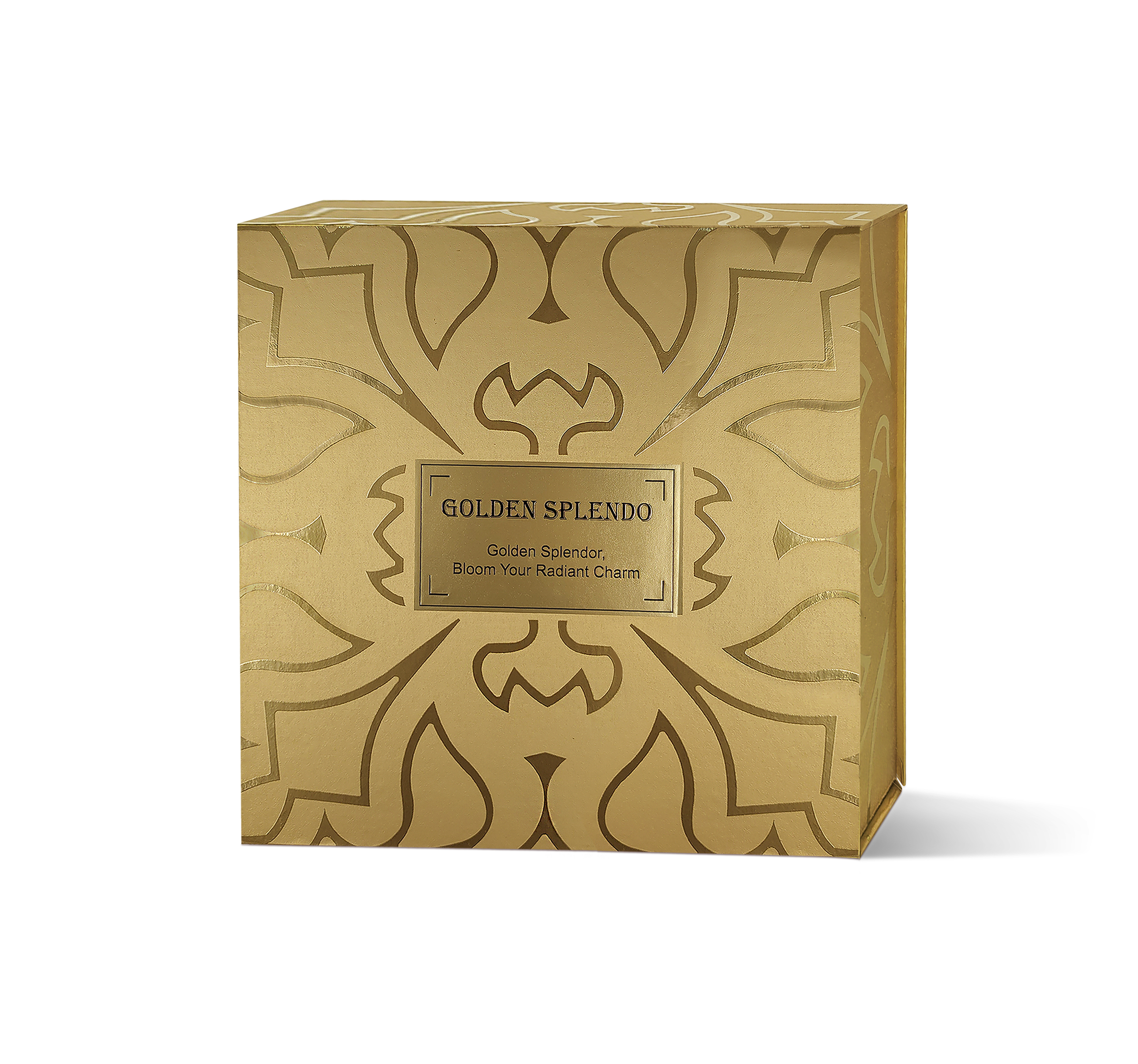 Classic bookshape construction, covered with gold paper, cold foil all over printed, embossed foil logo