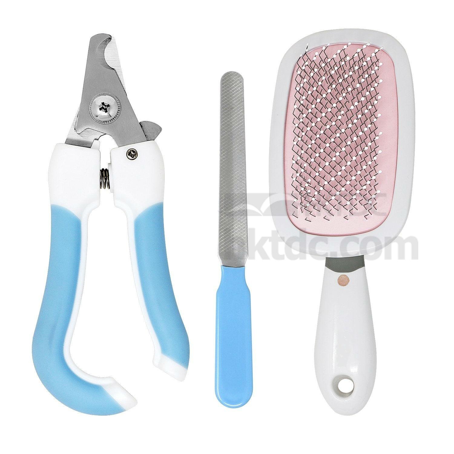 Featured here is a three-piece pet grooming brush set with a pet brush, a pet nail clipper and a pet nail file. The pet brush can massage for your dog or cat, make their hair puffy and open knots of the dog's hair. The nail clippers have stainless steel cutting edges to ensure effective trimming. The nail file allows you to trim your pet's nails easily.
