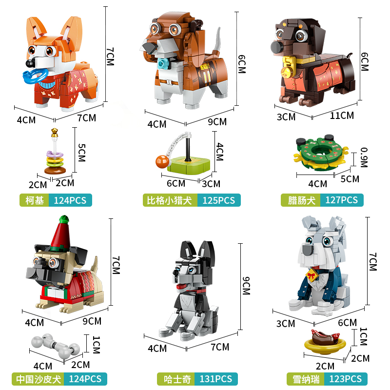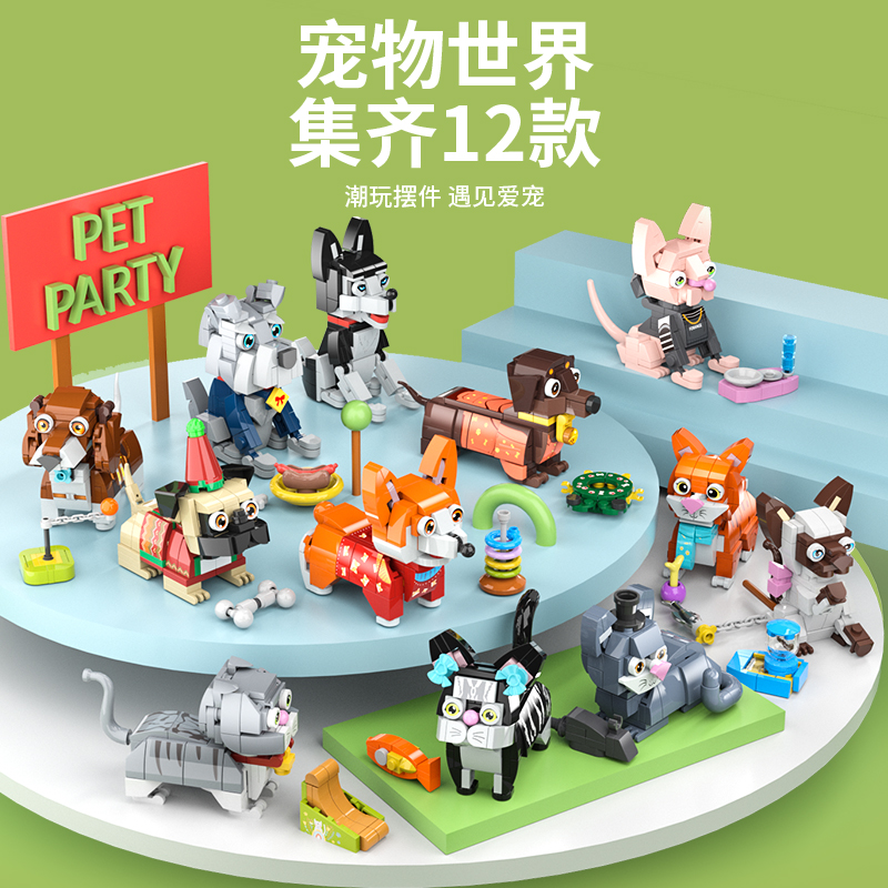 Pet-themed plastic building block toys, featuring 12 different cats and dogs.