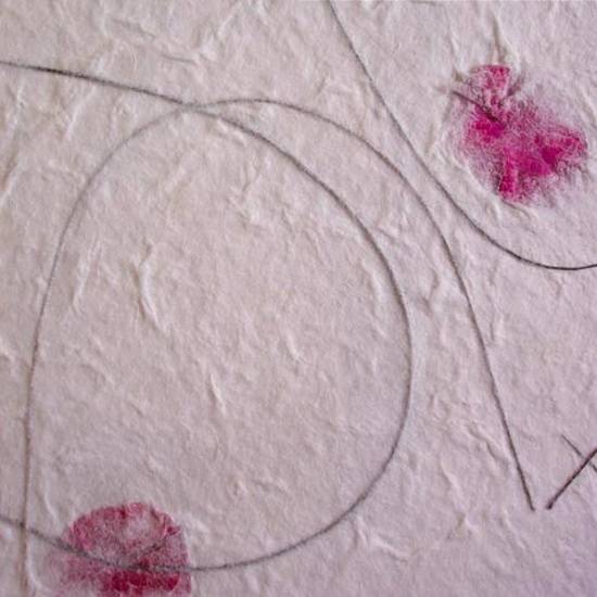 This is a piece of artistic handmade paper. The paper is adorned with red pedals and threads. It is ideal for gift packaging.