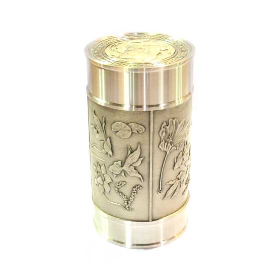 This cylindrical-shaped tea caddy is engraved with refined leaf and flower motifs on the body. Crafted of pewter, the tea caddy showcases a brushed finish. The air-tight tea caddy can preserve the flavor of your favorite tea.