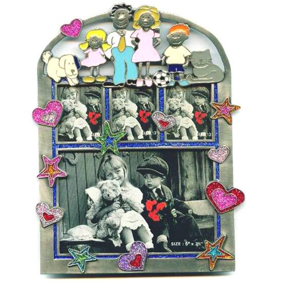 The featured photo frame made of metal, having a families and friends design, with colourful decorative pieces set around the frame, making this photo frame the ideal one to display your favorite family moment captured.