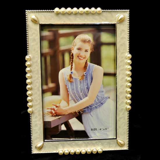 This stunning photo frame boasts contemporary elegance with the sleek rectangular shape and the pearl-like accents. Showcase your favorite photograph in style with this exquisite photo frame. This photo frame fits standard 4" x 6" pictures.
