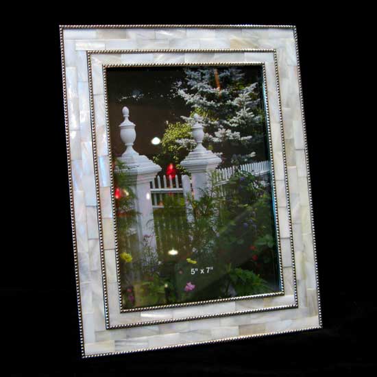 This photo frame stands in portrait orientation. The frame is composed of elegant nacre pieces resembling bricks. The tiny studs separating the frame exhibit uniqueness. Keep your precious life moment with this exquisite photo frame.