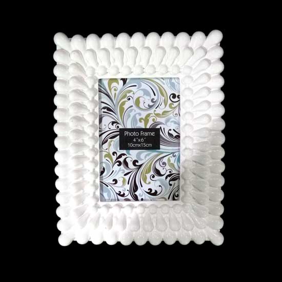 This rectangular photo frame in white features drop-shaped decorations for a unique visual effect. It is made of resin to ensure sturdiness. This fancy photo frame is ideal for showing your best moments.