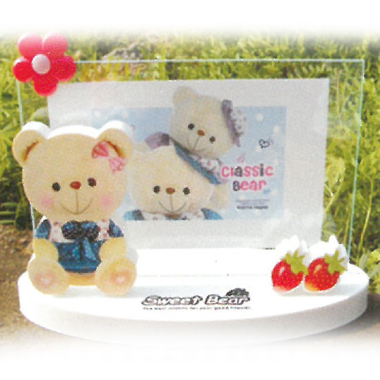 This is a photo frame for mothers to record their babies' growth. It is adorned with a bear, a flower and two strawberries. This item is a heart-warming gift for the newborn.