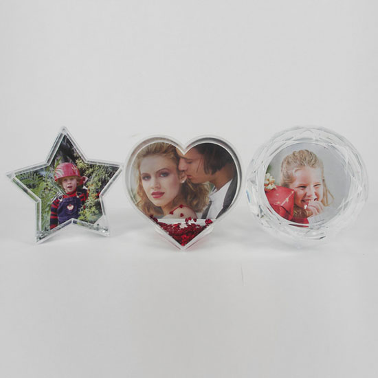 This clear photo frame features liquid decoration with sparkling pieces. They come in various geometric shapes for you to choose from. This beautiful frame complements your precious photos nicely.
