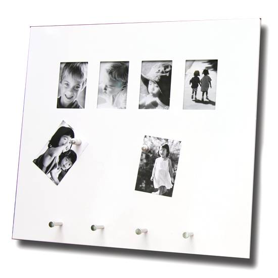The magnetic memo board with built-in photo frames. You can insert 6 x 9 cm photos. It comes with four keg hooks.