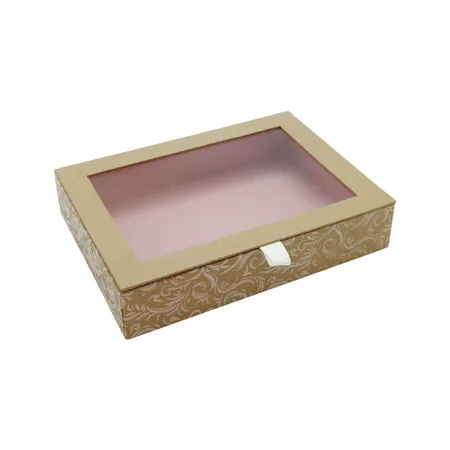 Specially designed for storing photos or photo album, this box features a rectangular silhouette and a window-equipped flip top for displaying its contents. It boasts a natural appearance in a Kraft paper construction, with intricate vine prints accented for an additional romantic flair.