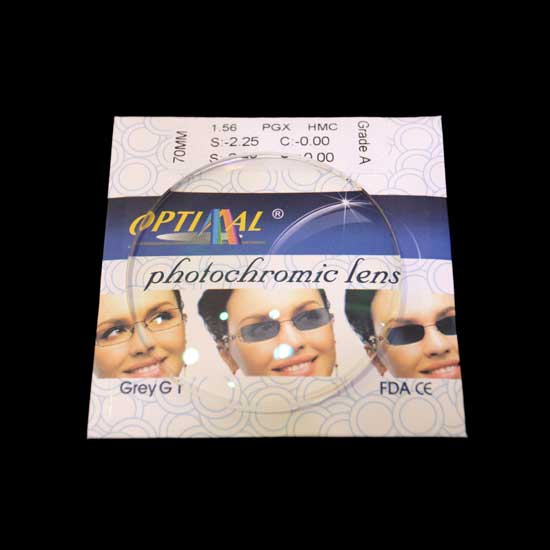 This displayed photochromic lens darkens on exposure to UV radiation. It will darken into a sunglass tint when exposed to UV for protection against harmful UV rays. It is compatible with a wide range of spectacles frames.