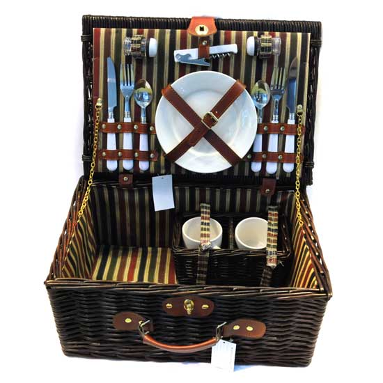 This spacious picnic basket contains all the accessories necessary for a picnic, including two mugs, two plates, metal cutlery items, a pair of salt and pepper shakers, and more. The basket features an elegant willow weave construction and is equipped with a strong and durable PU handle.