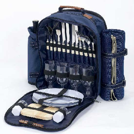Featured here is a refined picnic basket set designed for 4 people. It comes with full sets of tableware with glasses and a cutting board. A picnic blanket in matching color is also included for users' convenience.