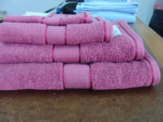 100% Cotton Single Pile Piece Dyed Dobby Towels, 350GSM, quick dri towels, with polyester insertion in the border to give a bling effect. (note: any size can be done in this quality)