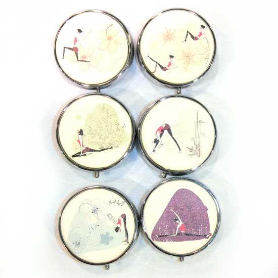 The round pill boxes are constructed with iron for a lasting quality. They showcase different well-designed yoga posture patterns. Simply carry your medications with these fashionable pill boxes.