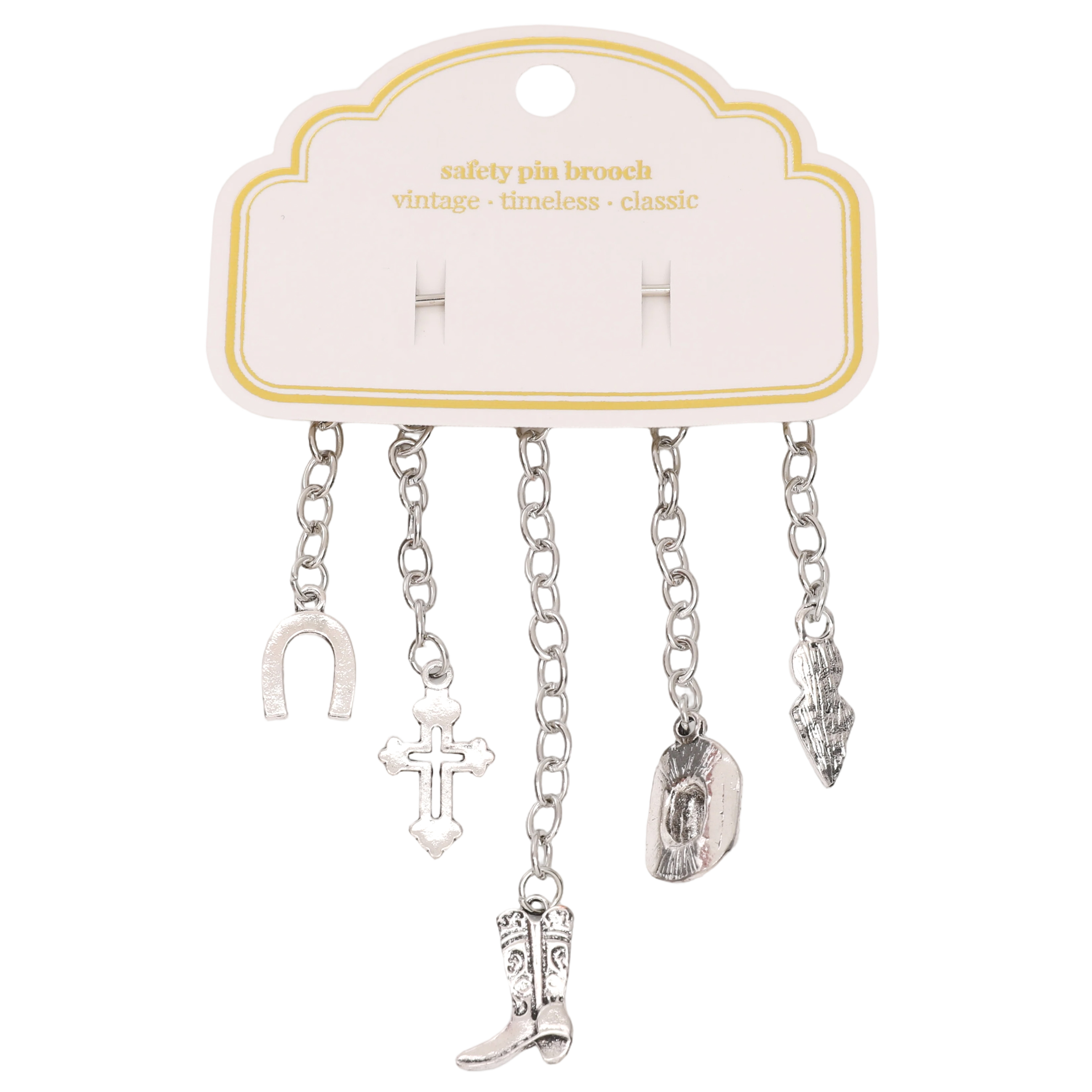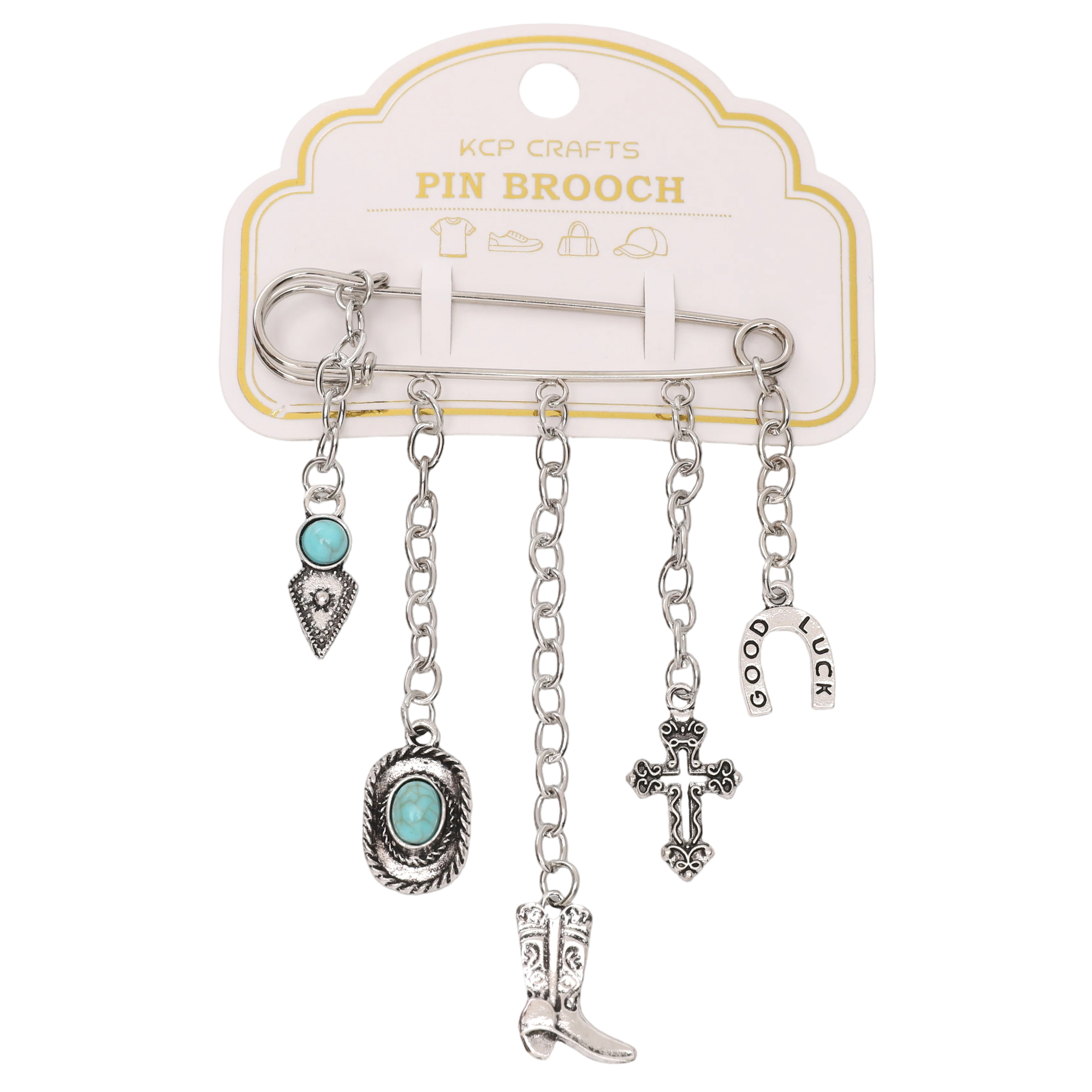 This western-style pin brooch with turquoise, cowboy boot and cross charms brings vintage bohemian charm to your look.