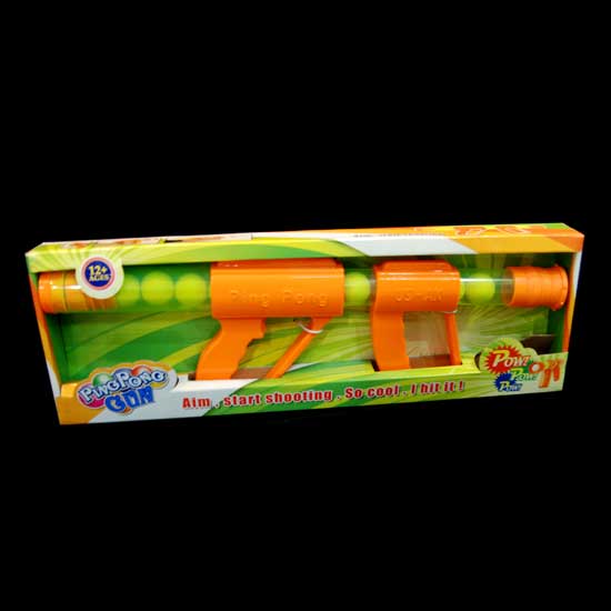 Shown here is a kids' toy gun called "Ping Pong Gun". The plastic gun is filled with a number of ping pong balls that are shot by pumping in air. This toy is suitable for kids who are 12 years old and older.