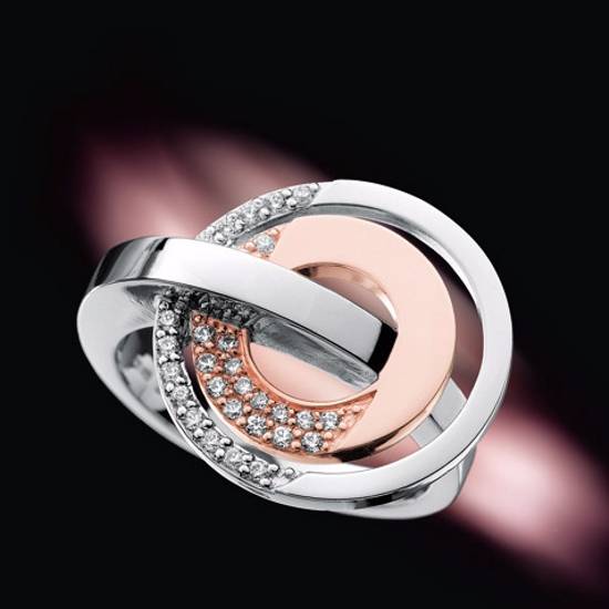 A pink gold diamond ring is designed with 2 round open work on the top.