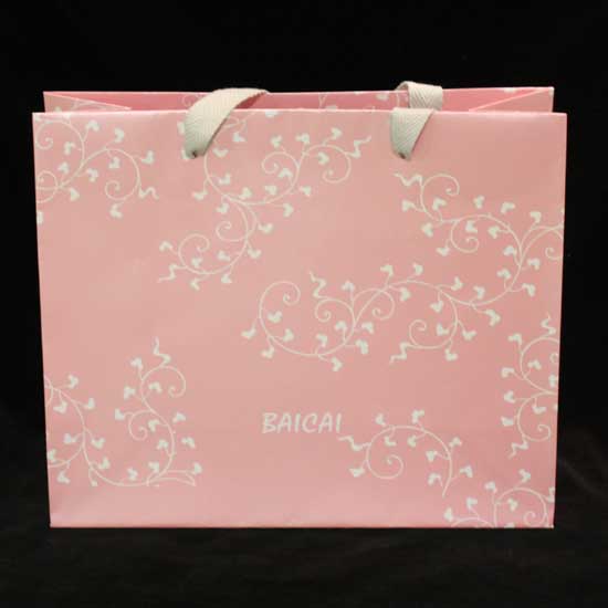 This glamorous paper bag comes in a pale pink color, giving a sense of delicacy. Printed with curly floral lines, the paper bag looks more graceful and vital. With wide off-white straps, the bag is able to carry heavy things. Pack your precious product with this gorgeous bag.