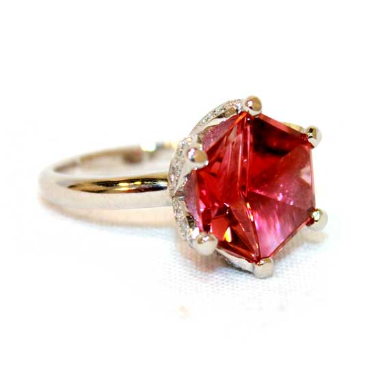 This pink tourmaline ring boasts a finely cut stunning pink tourmaline in prong setting. The side shimmering diamonds feature extra glamor. Adorn your finish and impress the people around with this ravishing ring.
