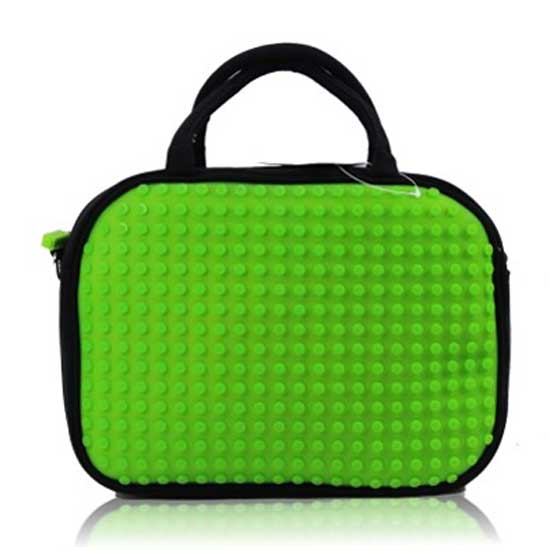 This novel shoulder bag is fitted with a green silicone front panel in a pixel dot design. You can personalize this shoulder bag by using round pixel puzzles. It is designed with top handles and a long shoulder strap for hand or shoulder carrying. The