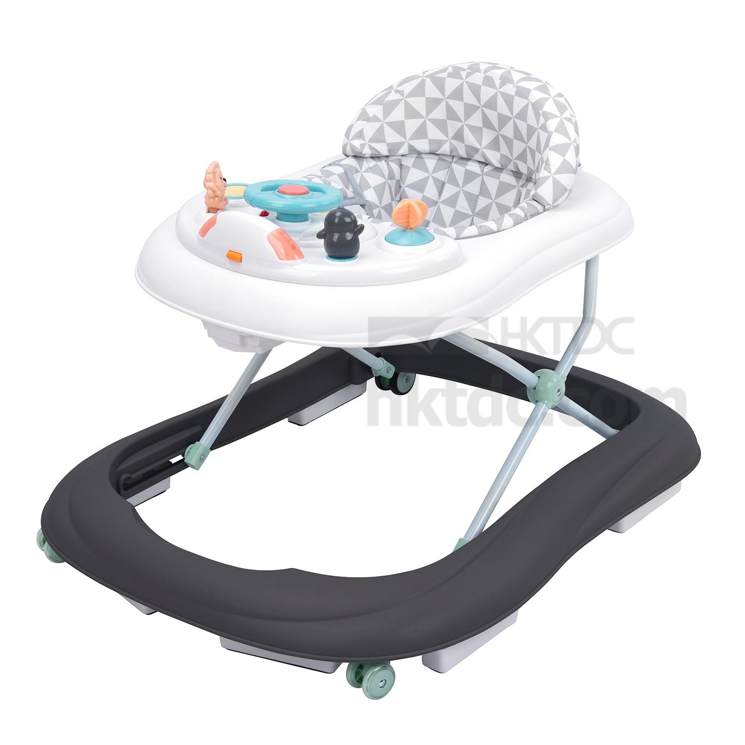 The featured baby walker is designed for children 6-18 months old and can promote development with music, light and rhythm. It has a padded seat that can be removed for washing and can be folded flat for easy storage and travel. The baby walker has 3 height adjustment settings and is equipped with brake pads and rear grip wheels for safety.