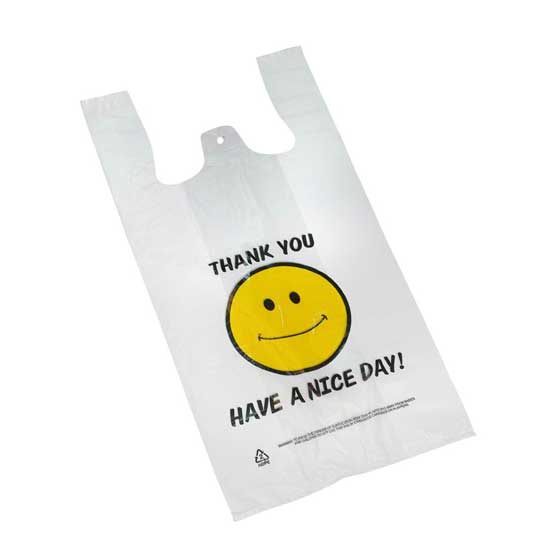 Presented is a plastic bag that is adorned with a cartoon smiling face to add differentiation. The quality plastic material offers lasting durability and is suitable a substantial amount of content. This plastic bag can be printed with assorted logos and captions for promotional use.