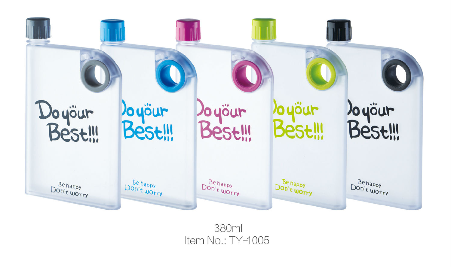 This plastic bottle comes in the design of a book and is embellished with inspirational messages on the exterior. It has a offers a capacity of 380ml and has a loop at the corner for convenient carrying. The plastic bottle is easy to store inside bags and can provide convenient access to hydration.