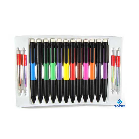 This plastic color pencil set comes with 12 mechanical color pencils with four tubes of color pencil lead. The color pencils are perfect stationery for kids' art projects. Each pencil comes with a small eraser on the top.