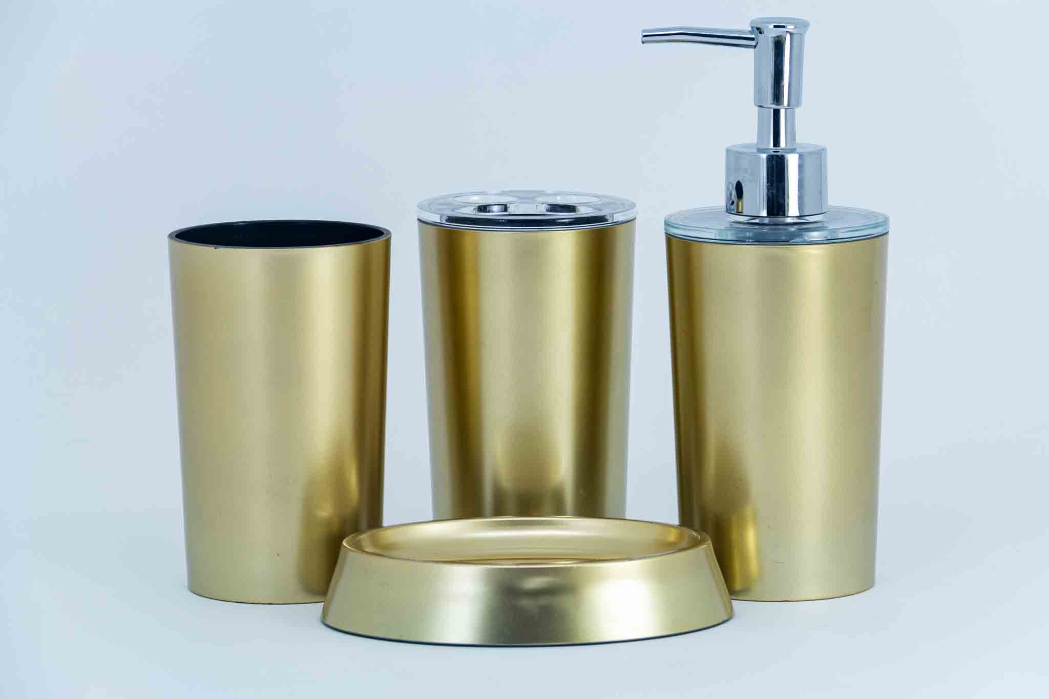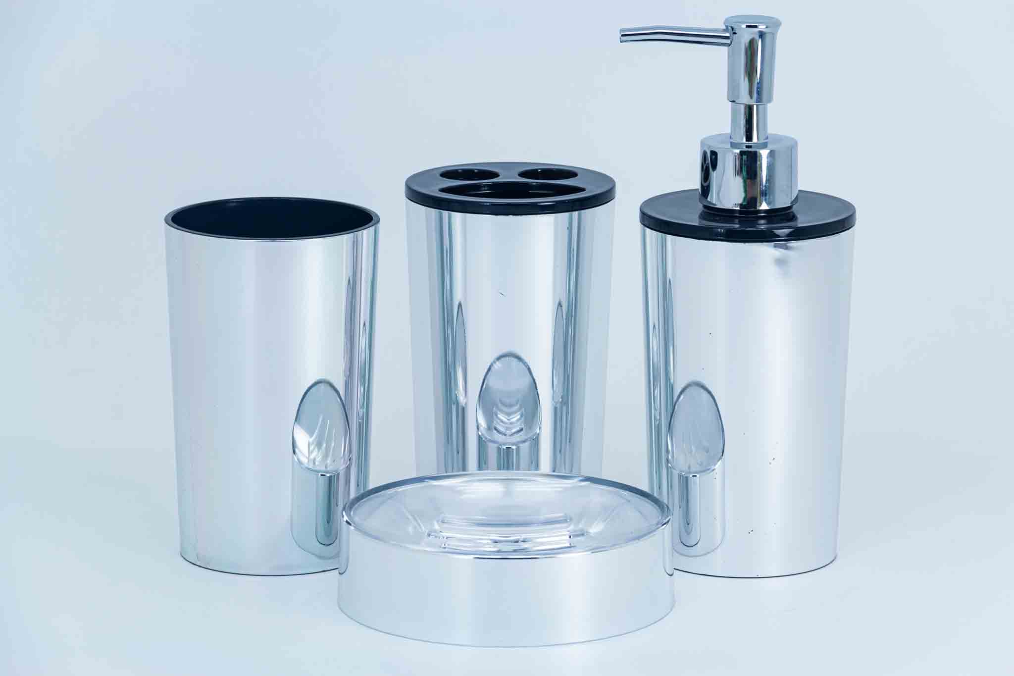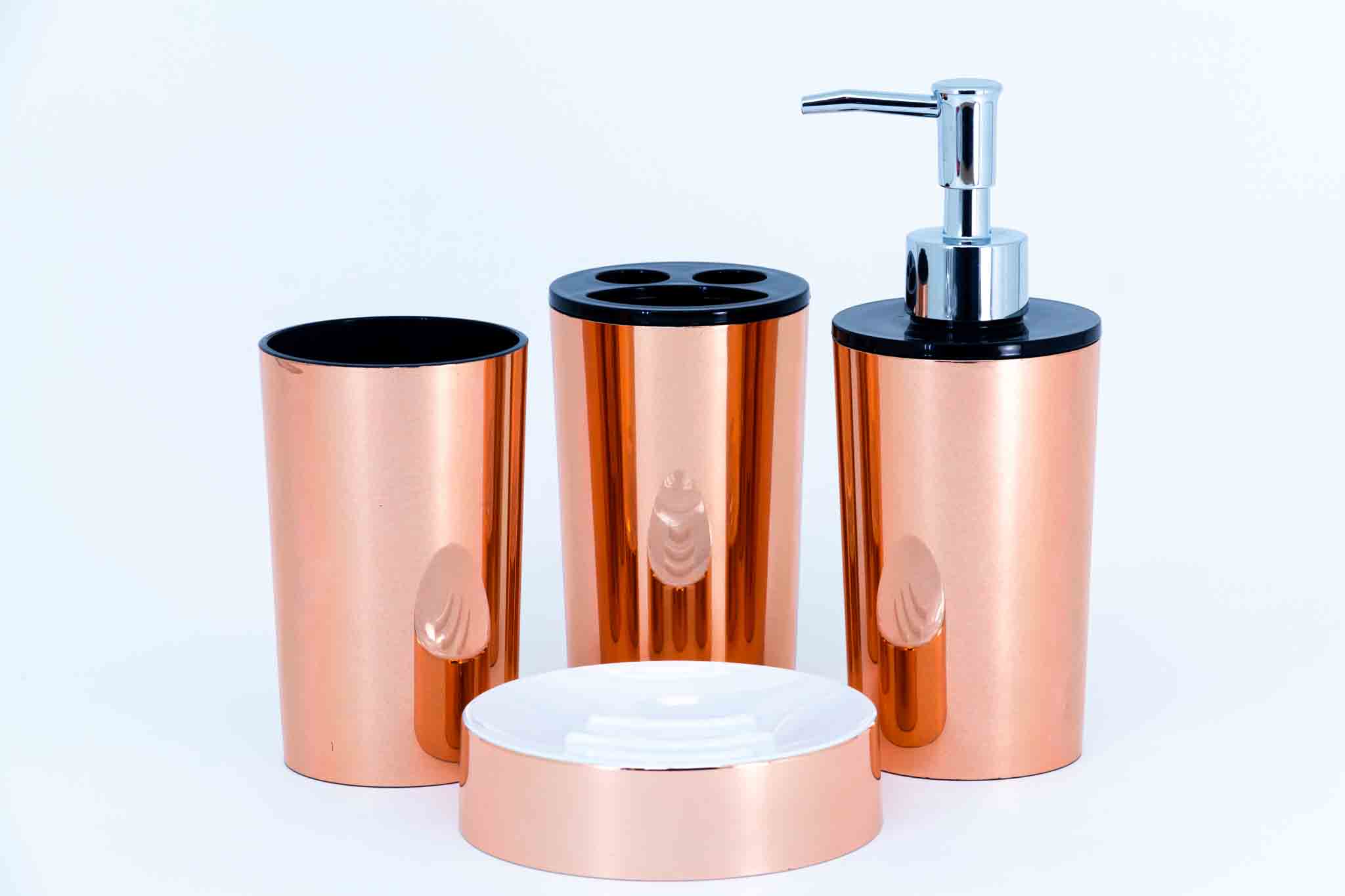 - Plastic bathroom accessories including lotion dispenser, toothbrush holder, tumbler and soap dish. Cylinder shape design in metallic finish decal. Simple concise design can perfectly blend into modern minimal art style architecture