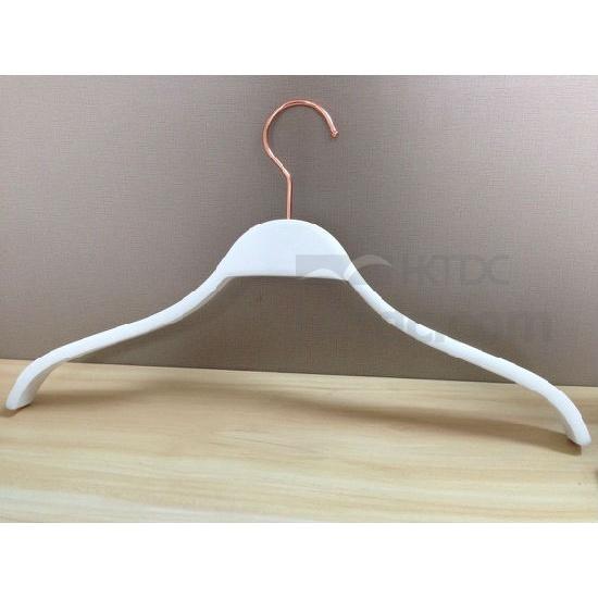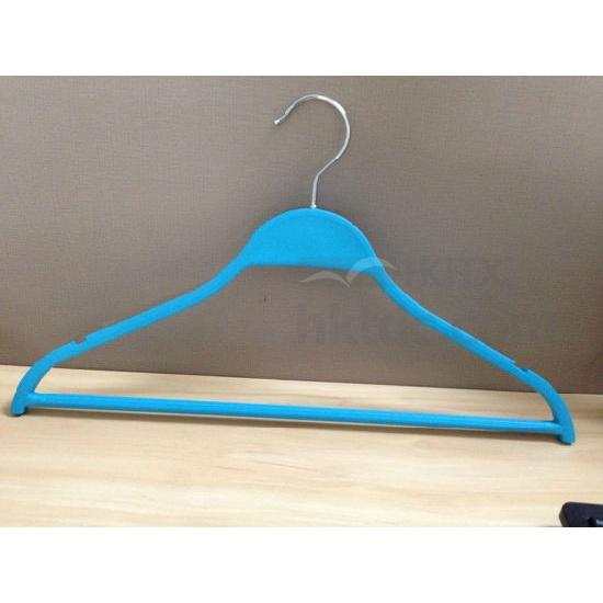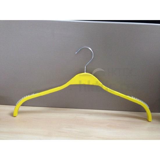 Displayed is a plastic hanger that is available in two styles, with one for tops and one for pants. Made of high quality plastic, these hangers are light and smooth. The semi-transparent black color gives the pieces a modern feel.