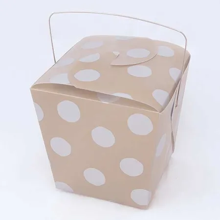The PP box features a trapezoid shape highlighted by polka dots. It comes equipped with a metal handle for easy carrying. Pack colorful candies, homemade cookies or other goodies with this PP box.